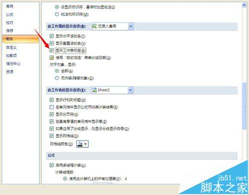 2、选择高级,向下滚动,在此工作薄的显示选项下勾选显示工作表标签
