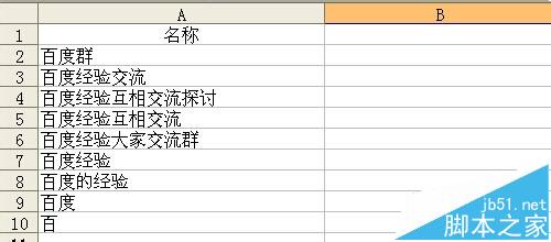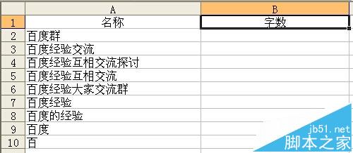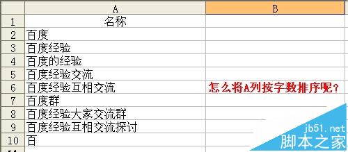 2、在这里主要以A列的数列为主,让A列的名称内容按照字数从少到多进行升序排列,直接在A列进行升序排列是不准确的,需要再B列中进行数字转换,首先在B1的标题中写上“字数”名称。(如下图)