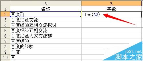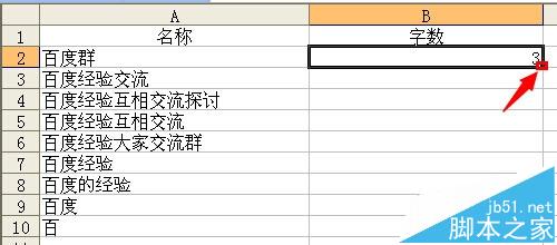 4、输完公式之后,直接点击enter(回车键),就会出现一个数字3,跟A2中的“百度群”对应,说明3代表的是3个汉字,然后把鼠标放在在B2单元框中的右下角,当出现一个“+”符号的时候,双击鼠标左键,进行数值的填充和下拉。(如下图一、图二)