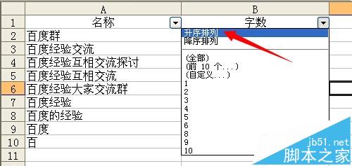 7、在B列中选择升序排列之后,可以看到B列中的数字是按从小到大的方式进行排列,而A列中的汉字也同样出现按照汉字的多少进行排列。(如下图)