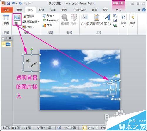 2、我制作的动态背景是要让蓝天大海的背景有船划过还有海鸟飞过,让PPT这张背景图片活起来,插入海鸟跟船只的图片,这里提醒最好插入的图片为背景透明的图片,让与原PPT背景素材融合得更好哦,点击“插入”的“图片”插入ppt背景素材: