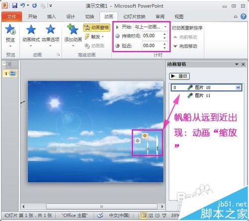 4、之前的切换效果只是让PPT背景图片出来,现在我们继续设置其他PPT背景素材的动态出现,例如,设置两个帆船从远到近划过来,点击帆船的图片,然后点击菜单项“动画”(幻灯片自定义动画)→“添加动画”→“进入”的“缩放效果”,设置帆船动画的开始时间为“与上一动画同时”,持续时间为5秒,然后预览下效果,是否效果从远到近出现呢?