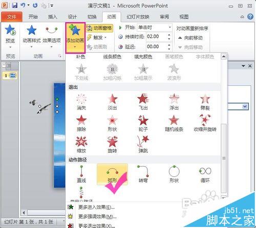5、紧接着来设置海鸟飞过海面的动画,点击海鸟的图片,同样点击“添加动画”→“动作路径”→“弧形”,这个时候“海鸟”的图片就有了一个弧形的动画路径: