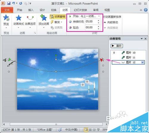 7、现在海鸟跟帆船的动画都设置好了,你可以预览下效果啦,点击“动画”的“预览”按钮,因为我们设置了海鸟跟帆船的动画开始时间均为“与上一动画同时”,所以它们的ppt动画效果一起播放: