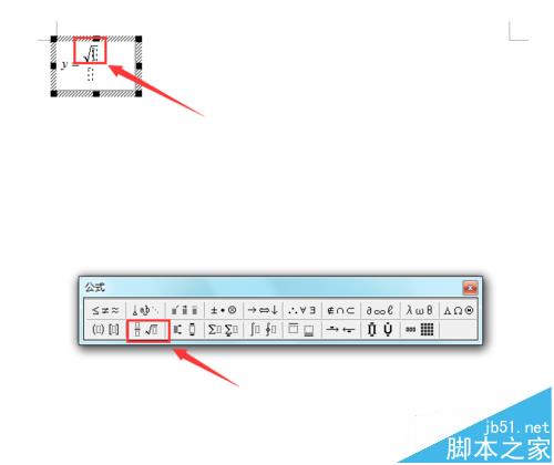 8、让光标在分式的分子上面,然后选中公式里的分式和根式模板,在下拉菜单里选择开方符号,在编辑区就出现了开方符号,如图所示: