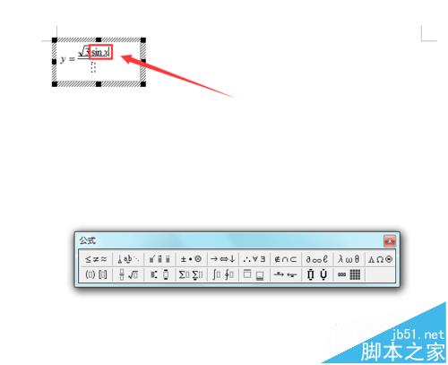 9、光标在开方里,我们输入数字”3“,并将光标移出开方符号外,输入”sinx“,分子就输入完了,如图所示: