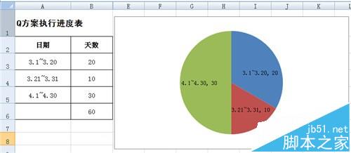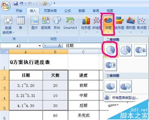 1、打开excel,建立所需数据源,选择周期数据源,【插入】--【饼图】--【二维饼图】,选择第1个饼图,建成饼图,颜色可自行选择调整。