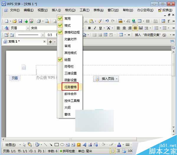光标点击页眉或者页脚处,然后右击菜单栏空白处,选择任务窗格。