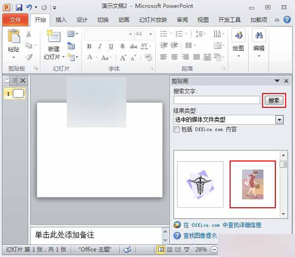 启动PowerPoint2010,单击菜单栏--插入--剪贴画,右侧出现窗格,单击搜索按钮,下拉滚动条,找到一张图片插入到页面中。
