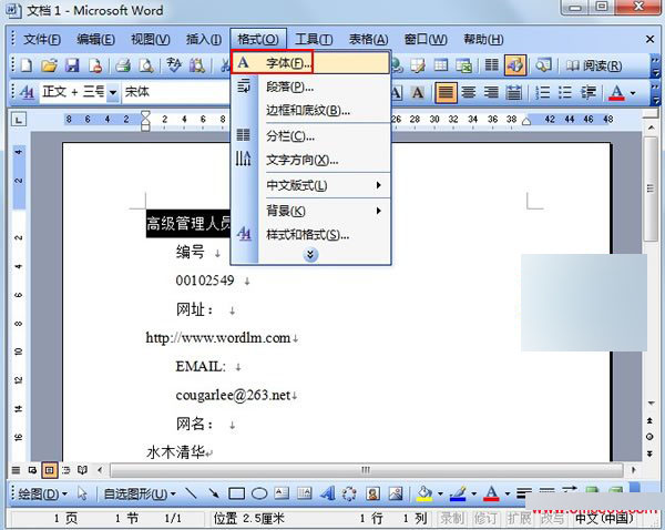 启动Word2003,鼠标选中需要进行“隐藏”的文字,单击菜单栏--格式--字体。