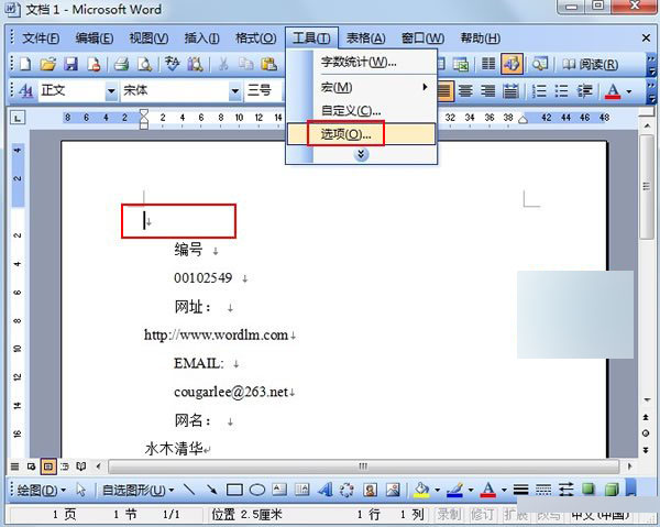 这样刚才选中的文字我们就看不到了,还没做完,单击菜单栏--工具--选项。