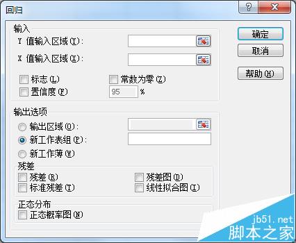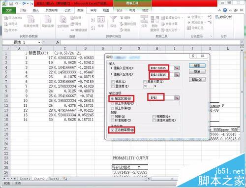 5、以X(j)为X轴,以Zi为Y轴(Zi为标准正态分位数),点击“输出区域”,选择要放置图表的单元格,选中“正态概率图”,点击“确定”。