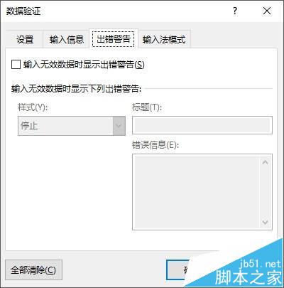 4、如果以后使用时,有可能不完全是从选项中选择,还有可能是自由输入,那么需要点选 出错警告-将输入无效数据时显示出错警告 的复选框取消掉。