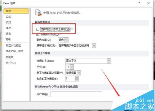 6、在“常规”选项卡的右侧窗口中,取消“用户界面选项”下的“选择时显示浮动工具栏”选项,而后点击“确定”按钮即可。如图所示;