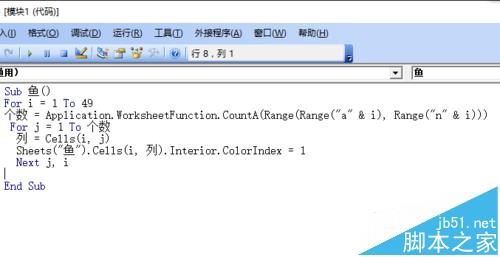 7、编程,通过读取“数据”表格里的数据,找到“鱼”表格里相应的单元格,涂色,这里我们图的是黑色。
