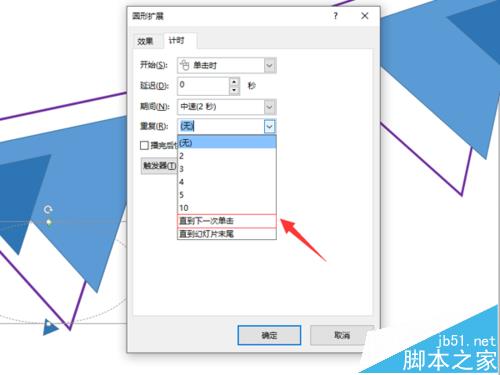 6、左键单击计时菜单栏下重复按钮右侧的下三角按钮,选择“直到下一次单击”,完成图形的动画循环播放制作;