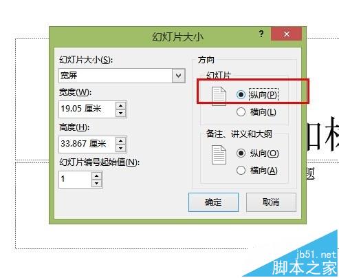 4、然后我们会在这一步中看到一个弹出的选项界面,需要我们进行选择,我们在这里将幻灯片的版式选择为”纵向“,点击确定。