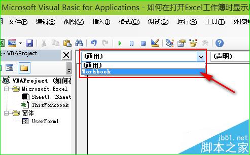 5、核心步骤——为ThisWorkBook添加代码。首先,双击资源管理器中的“ThisWorkBook”,如图所示;在打开的代码编辑环境下,点击“通用”下拉框,选择“WorkBook”,如图所示;在出现的事件过程中添加如图所示的代码——在打开工作簿时自动立即用户窗体的关键代码。