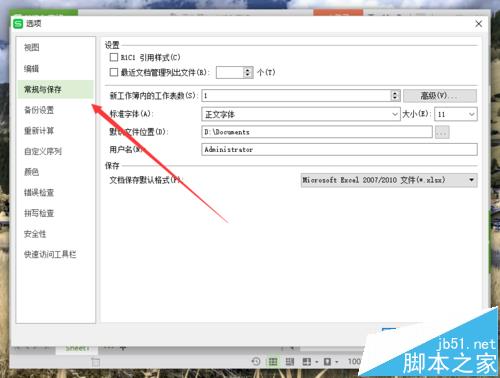 5、在“选项”对话框中,选择左侧窗格的“常规与保存”选项并点击它。如图所示;