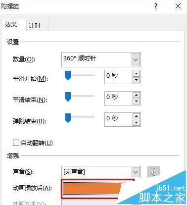 1、选中转盘,插入动画“陀螺旋”,打开动画窗格,点击动画后面的倒三角,选择“效果选项”,在打开的窗口中把“动画播放后”随便选一个颜色。