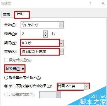 3、点击“计时”选项卡,把期间改成0.3左右,重复改成“直到幻灯片末尾”,单击“触发器”,把触发器改成写着“奖”的圆。这样,点击“奖”转盘就会转动,再点一次转盘就停止转动