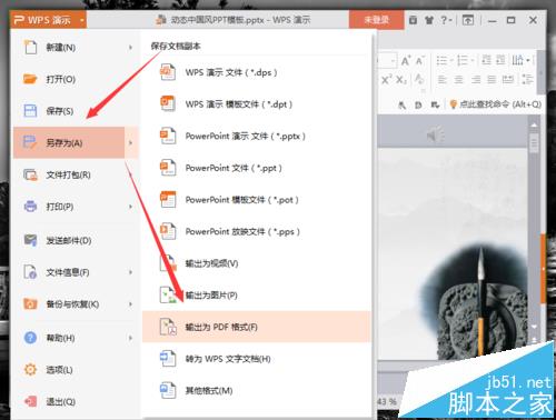 3、在弹出的“wps演示”命令选项对话框中,依次点击“另存为”--“输出为PDF格式”命令选项。如图所示;