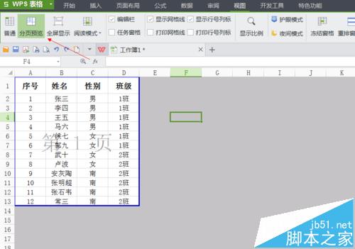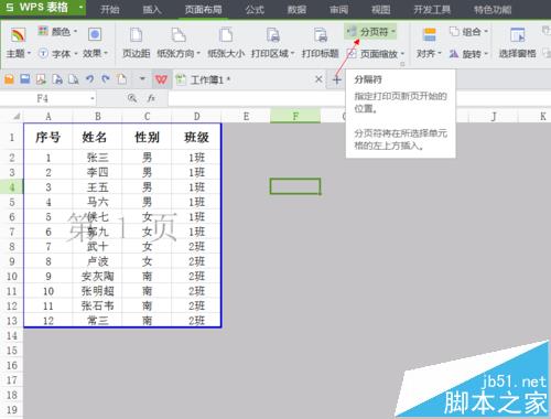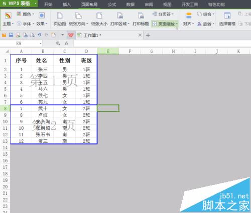 一张表格里面含有两个班级的信息,现在需要将这张表格分页打印,一个班级是一页,应该如何设置呢?