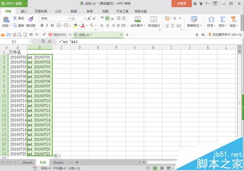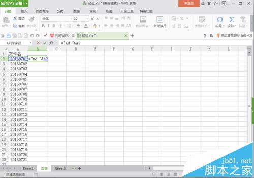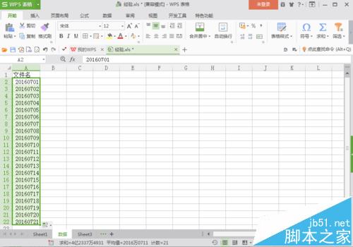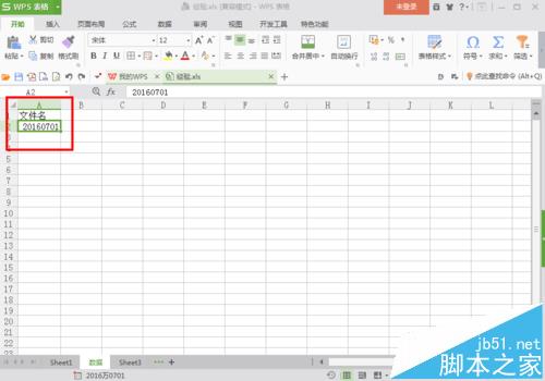 1、首先,建立一个WPS表格。打开WPS表格,在第一行第一列输入“文件名”,根据需要,输入你想要批量生成的文件名,这里输入的第一个文件名是20160701。