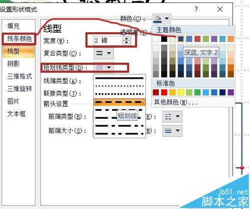 4、右键——设置形状格式——线型,宽度2磅,短划线类型选短划线。线条颜色选深蓝。