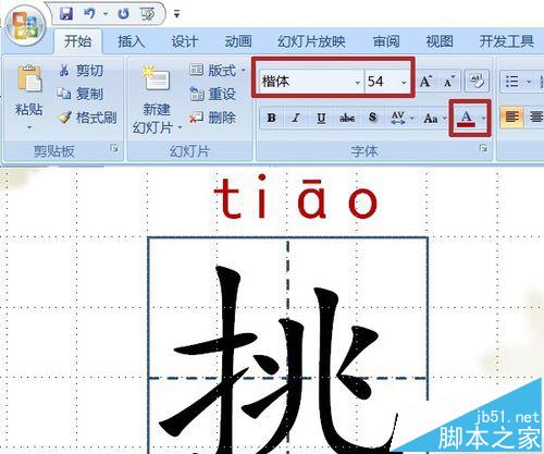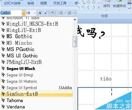 5、选择字体。想让文本框里出现正确的拼音字体,自然是在字体中选择。选中文本框,点开字体下拉箭头,鼠标在每种字体上划过,文本框中的拼音就会显示相应的字体样式。找找看,可以找到不少哦。我选择了楷体。