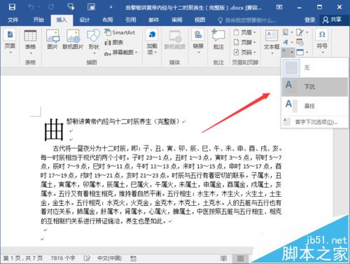 3、在“插入”菜单选项卡中,依次点击文本功能区的“添加首字下沉”-->“下沉”命令选项。如图所示;