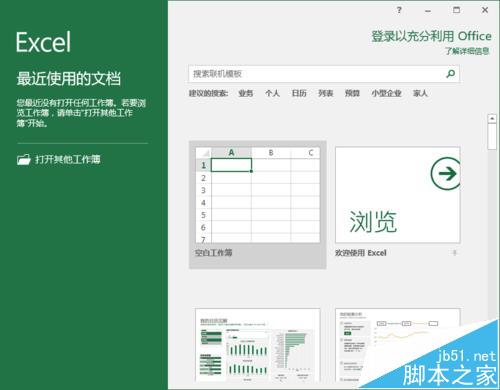 1、鼠标左键双击计算机桌面Excel2016程序图标,将其打开运行。在打开的Excel2016程序窗口,点击“空白工作薄”选项,新建一个空白Excel工作薄。如图所示;