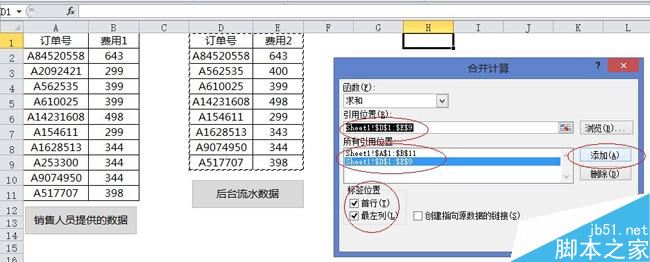 2.弹出的“合并计算”,我们参考下面的截图进行设置。将A1:B11单元格区域和D1:E9单元格区域的数据都添加进来。保持勾选“首行和最左列”。
