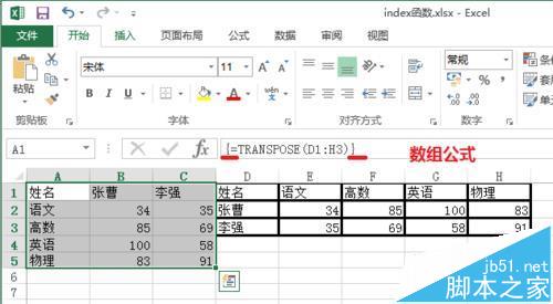 2、如图所示,输入公式=transpose(D1:H3)。由于是数组公式,所以输入公式后按ctrl+shift+enter。