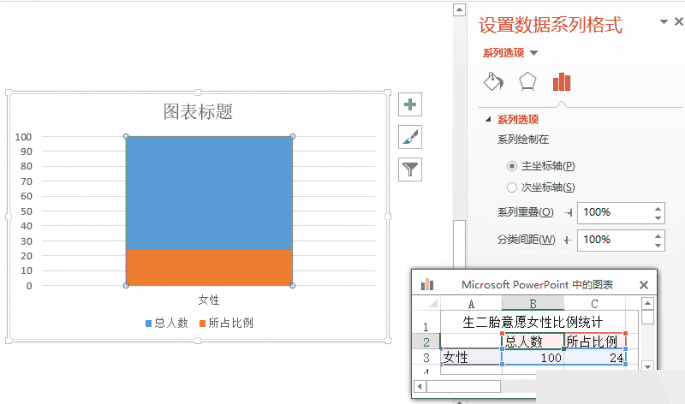 在空白幻灯片中,利用“插入”选项卡中的“图表”插入一个柱形图,输入所需要的数据,删除不必要的数据。选定垂直坐标,在右侧“设置坐标轴格式”的“坐标轴选项”选项卡中,边界处的最大值设置为100。选定图表中的女性系列柱形图,在右侧“设置数据系列格式”的“系列选项”选项卡中,设置系列选项的系列重叠为100%,分类间距改为100%,并将图表压扁,让数据区域呈正方形(图2)