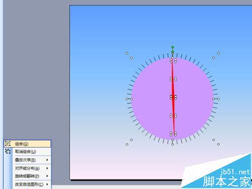 10、分别调整这两个指针的大小,然后选择这两个指针移动到表盘中央位置,选择所有的图形,执行绘图-组合命令,把所有的图形组合成一个图形。