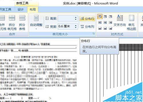 5、拉开后,表格只是最后一行被拉长,如图。选择布局——单元格大小——分布行,将各行平均分布。