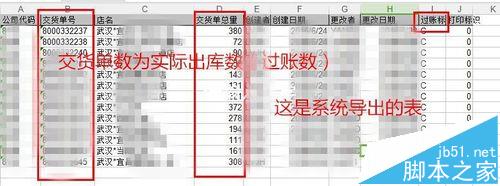 2、表二为系统过账的表,是从SAP系统导出来的表,里面有单号,店铺名,交货单数量(实际出库数量),以及过账标识。