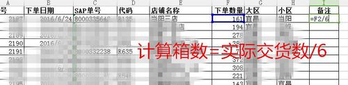 6、将下单数替换为实际出库数后,先得到箱数=下单数/6(下单数所在的单元格内容/6),此时箱数可能不为整数,另取一列输入”=“,利用ceiling()函数取整舍入,找到比该箱数大的最接近的整箱数。