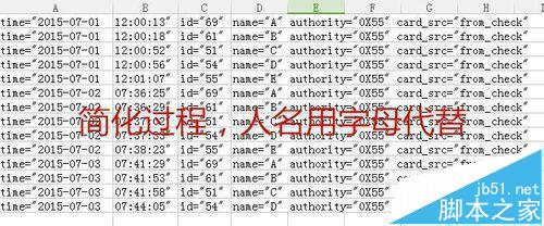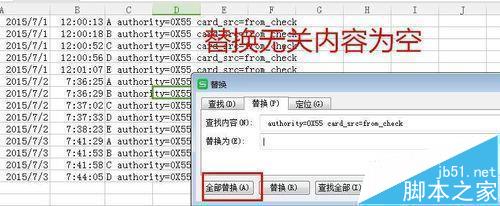 6、为了简化说明,我做了一个简表,人名用字母代替,“Time=”后面跟的是日期和时间,首先Ctrl+f,出现查找替换窗口,替换掉“time=“为空,点击全部替换,得到日期。