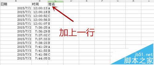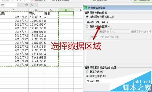8、数据透视前,插入一行,日期,时间,姓名,选择右边一列的一个单元格。“插入——数据透视表”,选择左右全部区域为数据透视表范围。