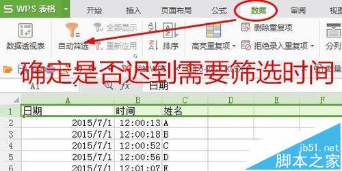 10、选择第一行,“数据——自动筛选——时间——数字筛选”,选择筛选的条件,比如早于早上8:00为正常,小于8:00:00。