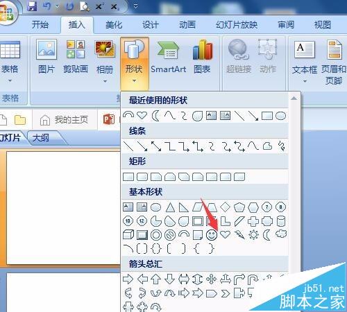3、画出心形图案。点击心形图案后在空白的幻灯片上画出来,大小适宜即可。
