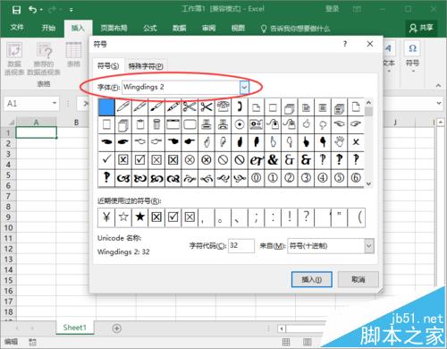 6、在“Wingdings 2”字体样式下,找到打勾方框选项并选择它,然后点击“插入”按钮。如图所示;