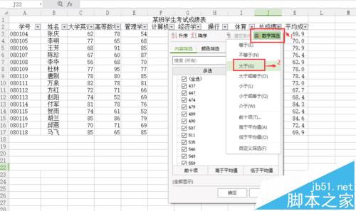 4、点击数字筛选,然后选择大于,输入500分。即可筛选出总分大于500的同学。