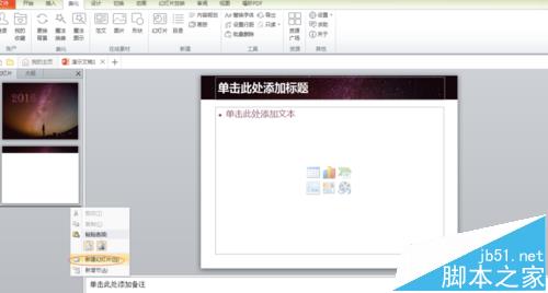 5、在页面左边空白处右击,找到“新建幻灯片”按钮,点击,我们将会看到相同模板但版式不同的幻灯片,那么接下来我们点击页面右上方的“最小化”。