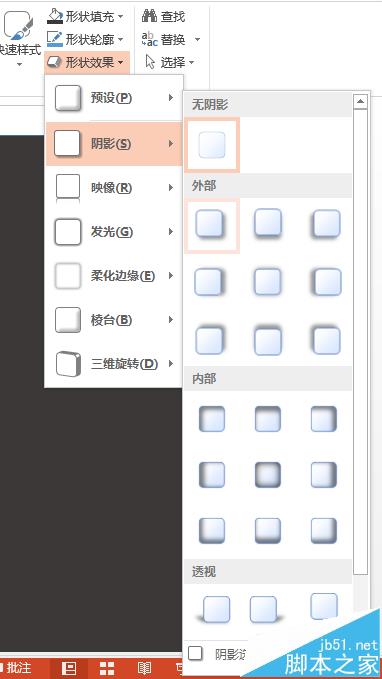 5、批量设置字母阴影。选中所有字,注意点击在“绘图工具—形状效果—阴影—选择第一个外部阴影”。