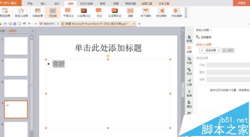 5、为你的幻灯片添加简单的动画特效。在最顶层找到动画,点击, 找到自定义动画 然后选中目标添加动画 ,注意要选中目标。
