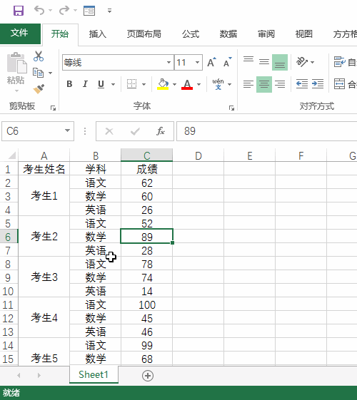 1、首先打开excel表格,看到有5个考生的成绩,我们想按照考生将其分为5个工作表,如下图所示: