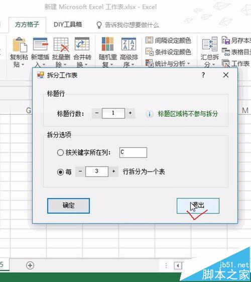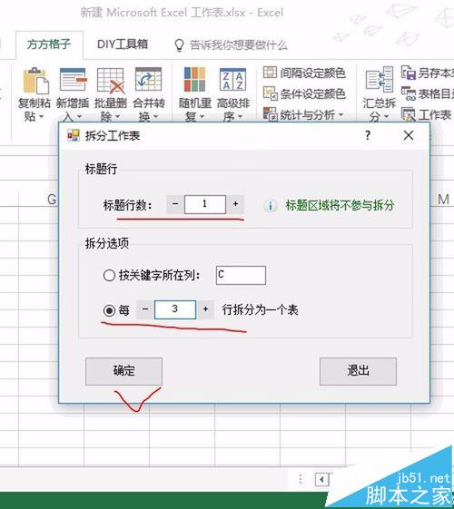 4、在弹出的对话框中,标题行数我们选择1行,然后每3行拆分一个工作表,如下图所示: